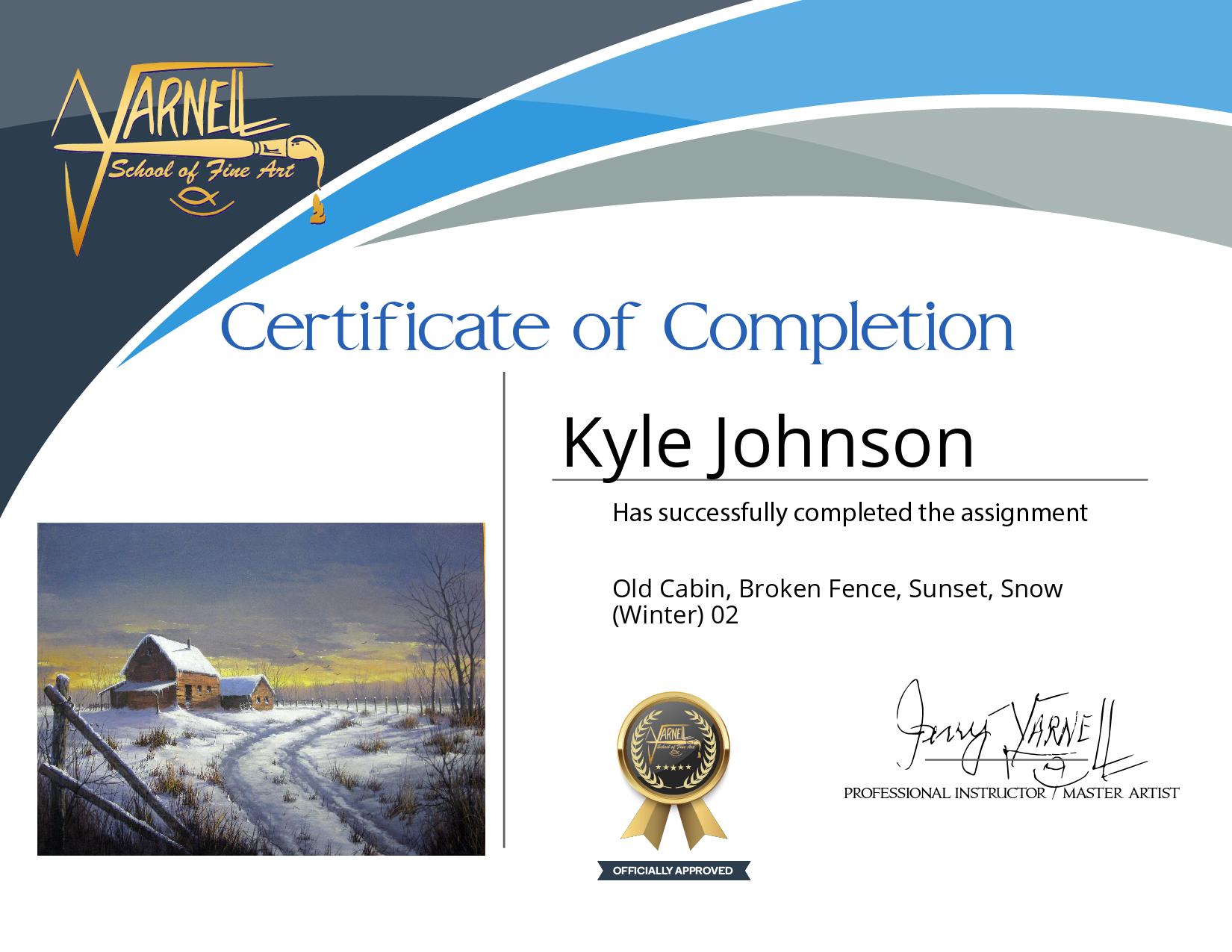 In this painting, I will be looking for proper arrangements of objects, i.e., building, fence, etc., so that you have good eye flow. I will be looking for proper placement of eye stoppers, correct perspective on the building, and proper under-painting color for snow as well as snow highlights. Also, I will be looking for proper script-brush use and finally good blending techniques on your sky.