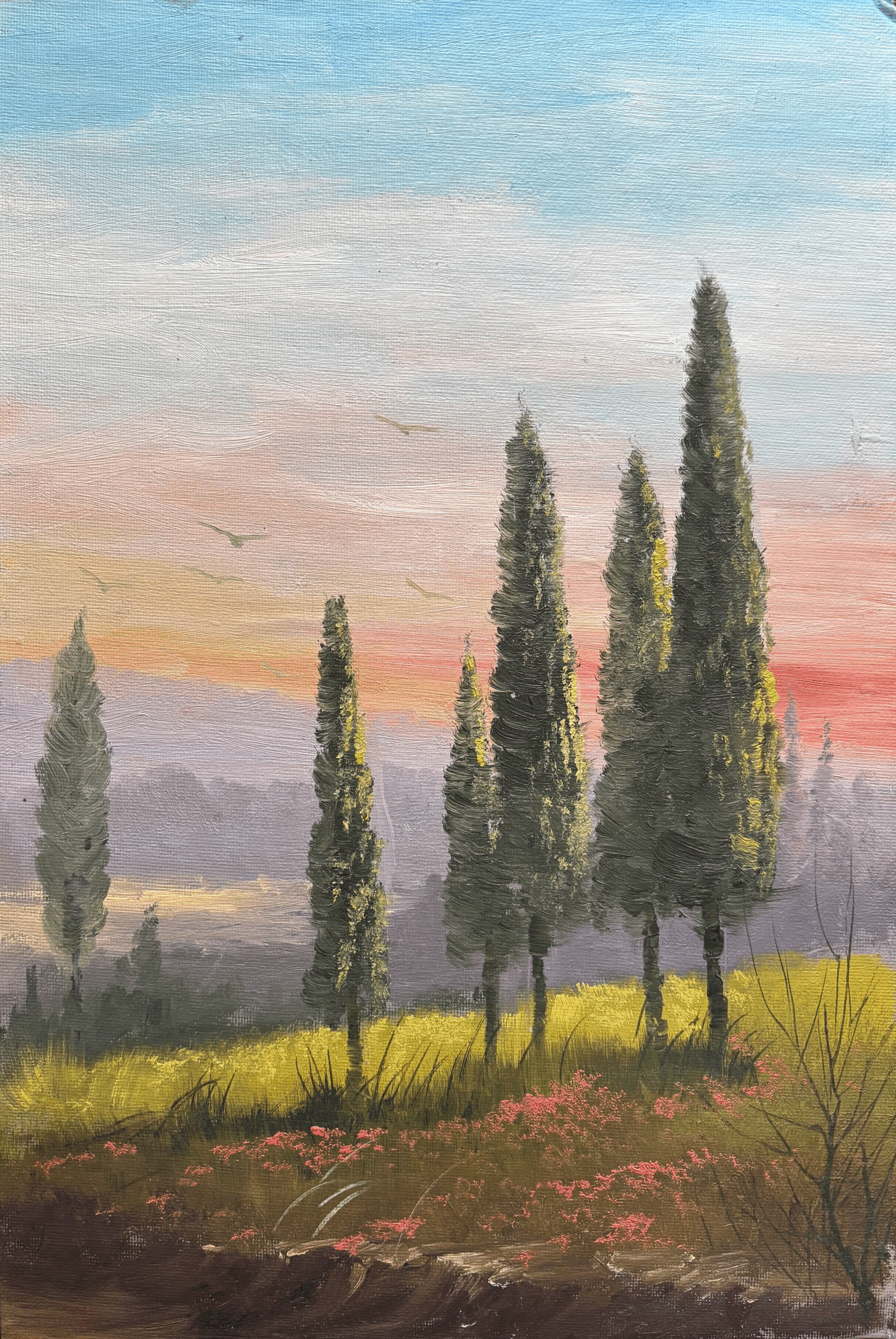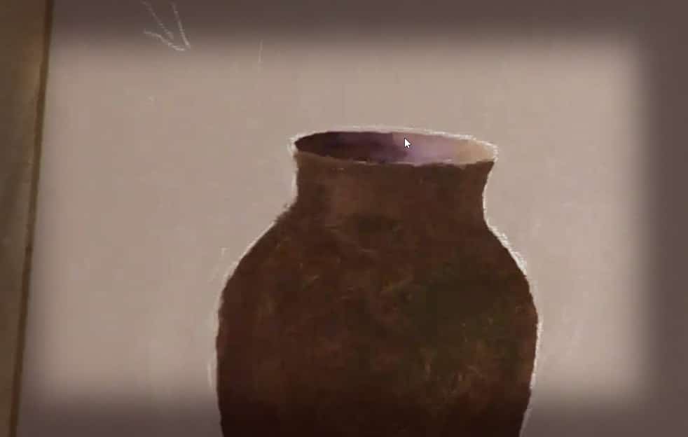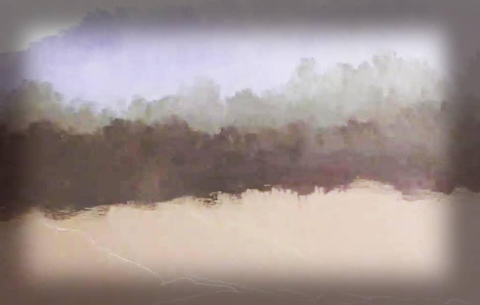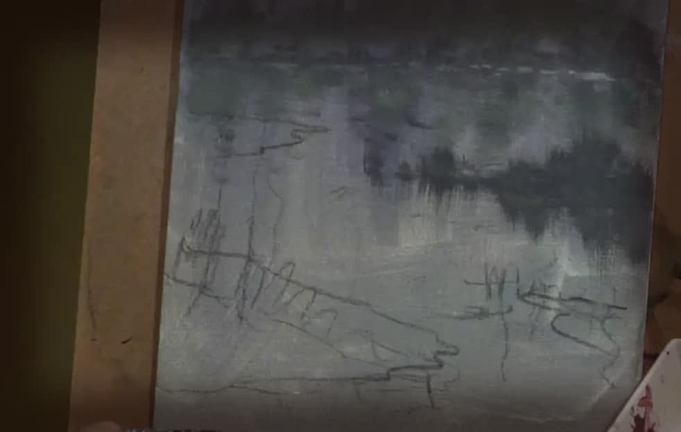 In episode 3, Jerry uses the #2 chisel-edge brush to block in intermediate details: horse, saddle, cowboys, etc. Now Jerry turns his attention to the campfire using orange, red, and white to mottle in the fire’s glow. Next Jerry begins detail to the wagon (wood grain, shelves, pockets, etc). Adds suggestion details to items sitting nearby. Now Jerry blocks in a “suggestive” cowboy and his hat. More work on the water and the bank in the foreground creating dimension. Sticking with basic tones, Jerry shows how to insert rocks which he calls “dark blobs” and then inserts reflections in the water.