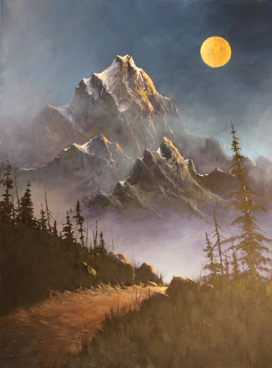 Now we will begin highlighting the distant trees and middle-ground meadow plus waterfall. At this stage you can begin painting in the bright tones of flowers and accent highlights on the trees. So, take your #6 Bristle Brush and fan it out and begin dabbing in various colors to create the suggestion of distant flowers and accent highlights on the trees and grasses. Don’t over-highlight and be sure you have enough contrast of dark and light tones. Also don’t be afraid to use any color you want for the flowers. Use pure White (Gesso) for the highlights on the waterfall and background stream.